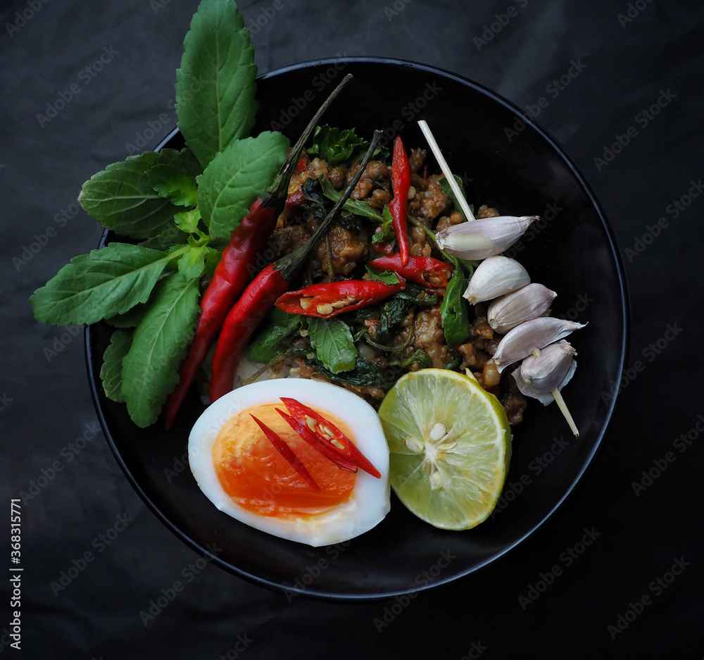 Thai food stir-fried minced pork spicy and basil leave with rice and boiled egg and black plate top view