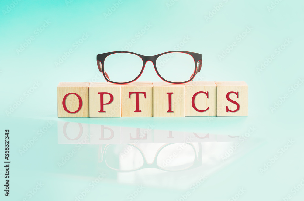 Eyeglasses on top of word OPTICS on mint. Glasses or spectacles reflected on mint background. Optics concept, eyesight or vision. Copy space
