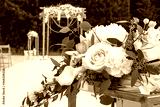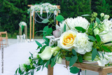 Wedding decor of ceremony outdoors in the forest, elegant decoration of wooden arch and close up flowers on the stand