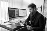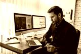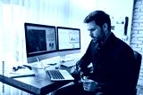 Preparing financial report. Young focused businessman or financial analyst sitting at his workplace in the modern office and working on laptop