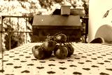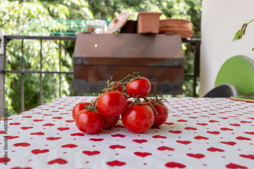 Truss tomatoes on the table with hearts textured table cloth. Rusty Barbecue in the background. Front View.