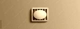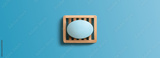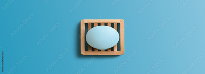Bar of soap in wooden dish on blue background. Directly above, Copy space.