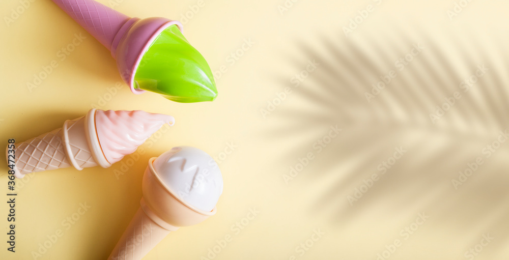 Abstract ice cream on a yellow background with a shadow from a palm tree. Summer pop art concept