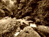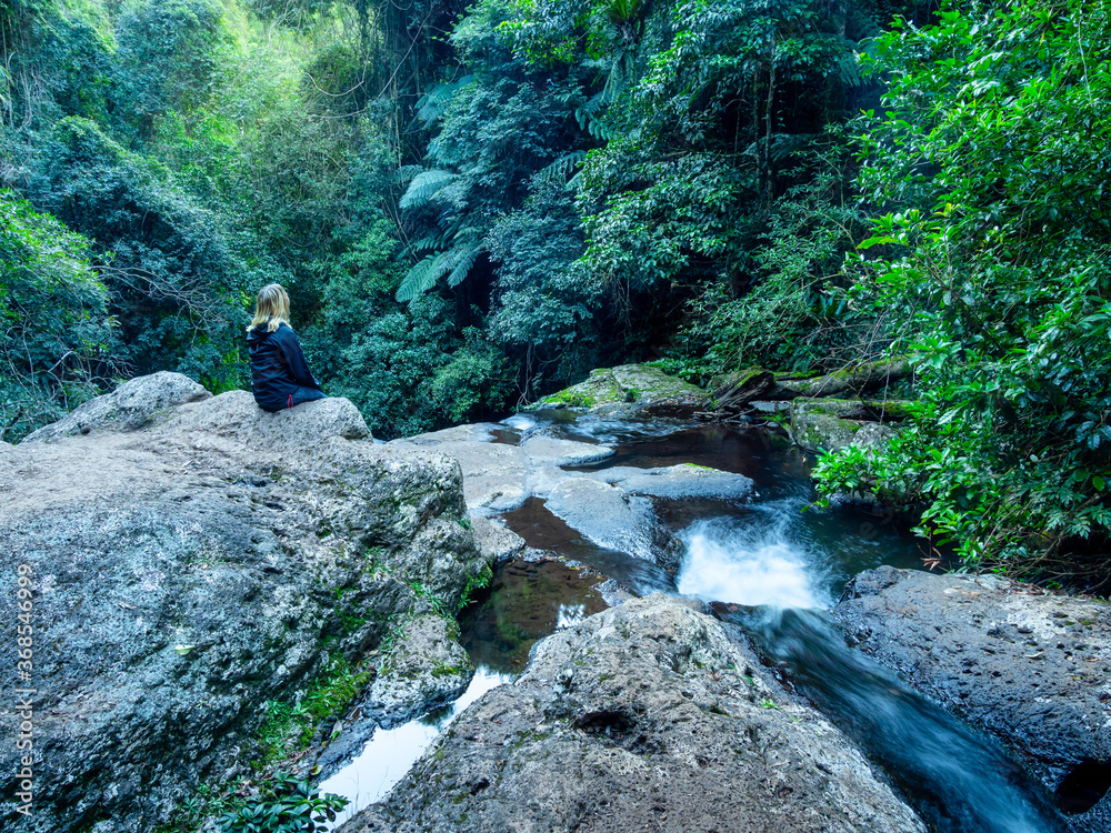 Lady Sitting by Waterfall in the Rainforest