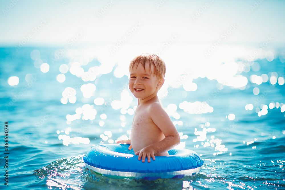 three years old boy playing at the beach with swimming ring