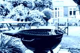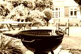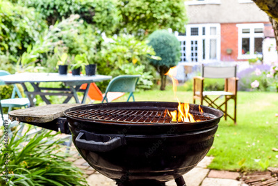 Bbq grill with flames in an empty back garden preparing to cook outside