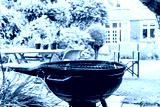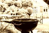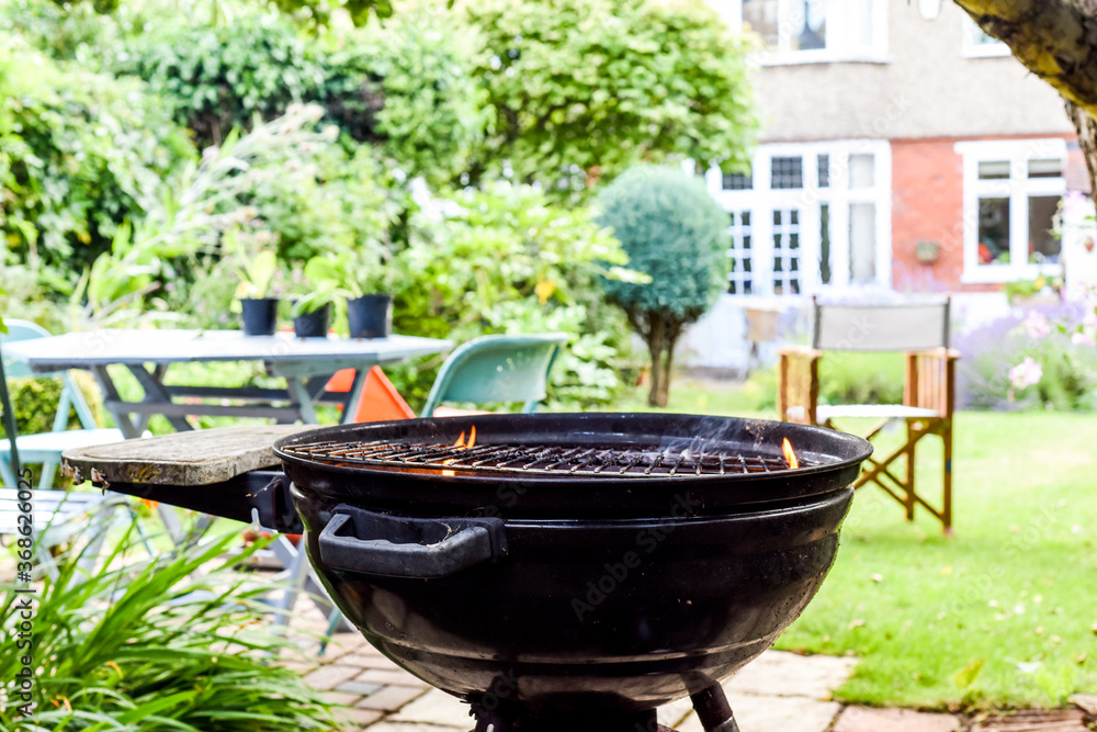 Bbq grill with flames in an empty back garden preparing to cook outside