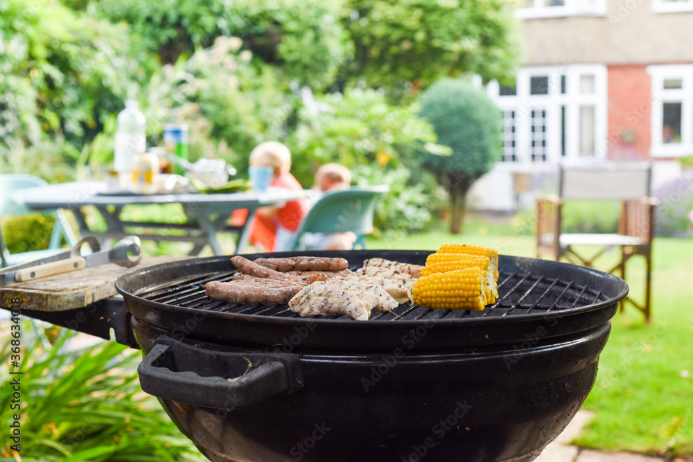 Family bbq outside in a garden with food on the barbecue grill cooking outdoors and people in the background