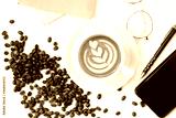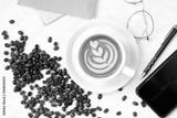 Top view coffee cup and coffee beans on old wood table background, space for text