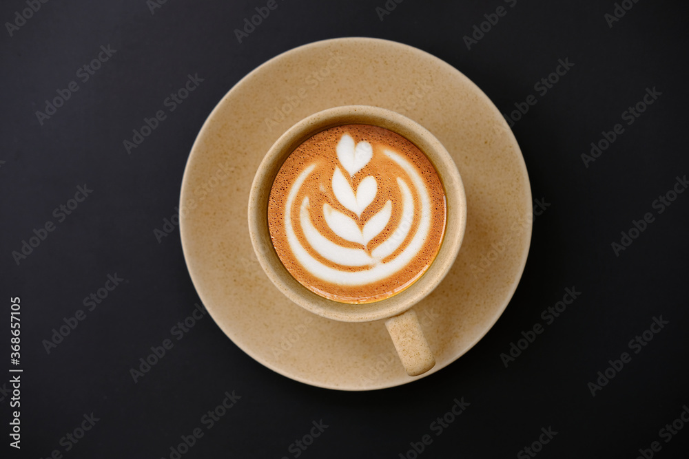 Top view coffee cup and coffee beans on old wood table background, space for text