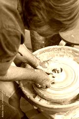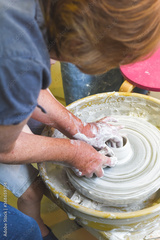Children learning to make pottery as a hobby with their grandmother in a ceramics workshop