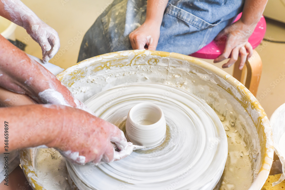 Children learning to make pottery as a hobby with their grandmother in a ceramics workshop