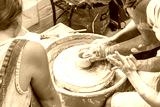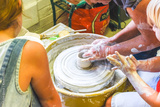 Children learning to make pottery as a hobby with their grandmother in a ceramics workshop