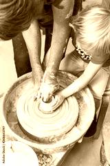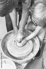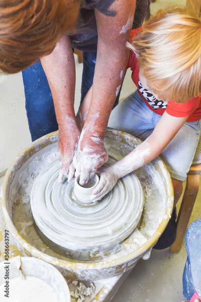 Children learning to make pottery as a hobby with their grandmother in a ceramics workshop