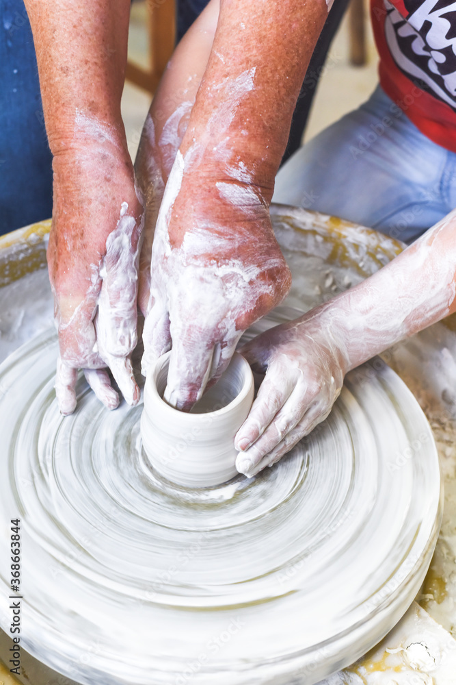 Children learning to make pottery as a hobby with their grandmother in a ceramics workshop