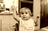 Baby girl sitting in highchair at table