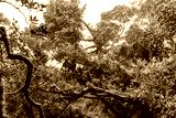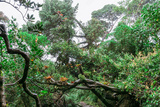 Tropical rainforest with tree trunks and epiphytes