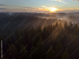 Beautiful sunset over the forest with white fog