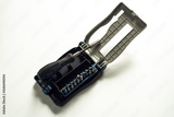 Plastic case with a screwdriver and a set of different metal attachments for it on a white isolate