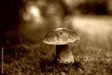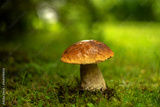 A beautiful white mushroom with a brown cap on a blurred green background in the grass
