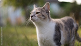 A beautiful homeless cat walks in nature, in the countryside, on the grass. Sunny day, a cat in the shade under a tree. Close-up, blurred bokeh background.
