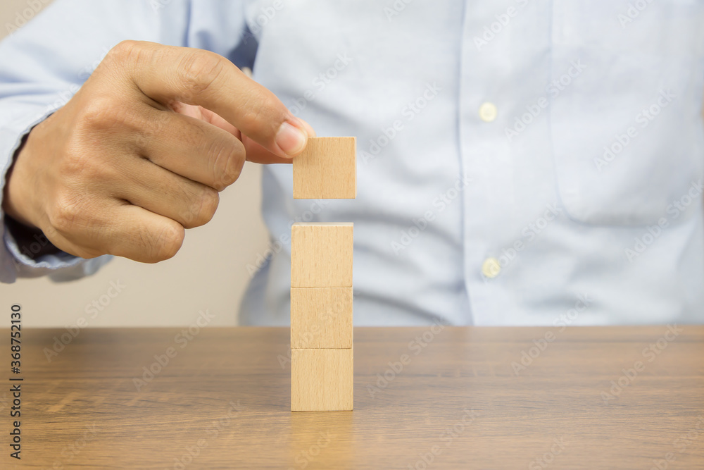 Close-up hand choose a cube wooden toy blocks stacked without graphics for Business design concept and activity for child foundation practice skills.