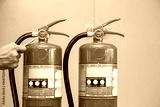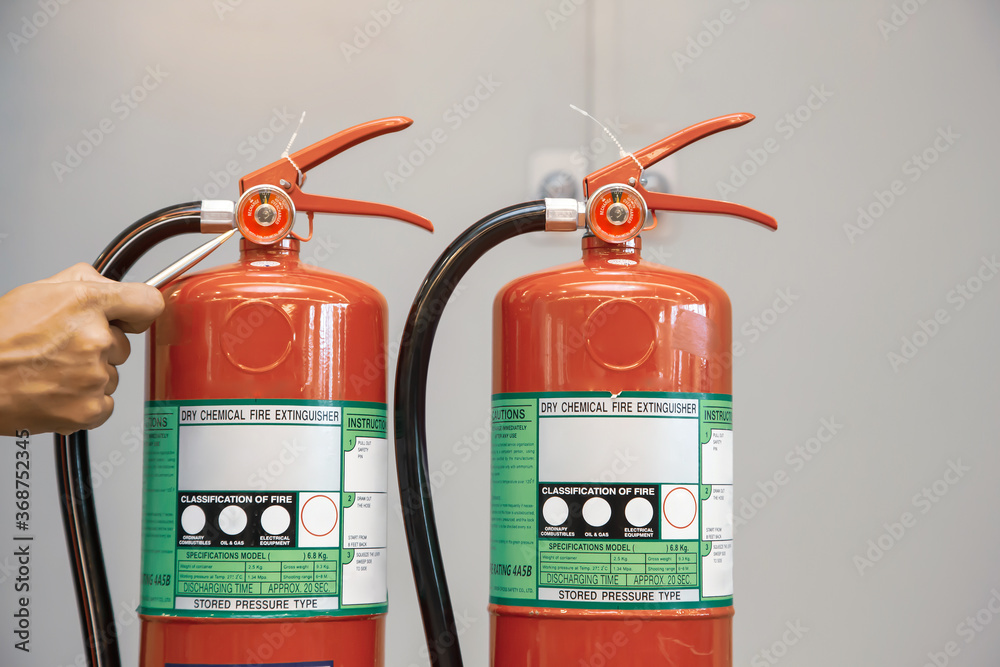 Firefighter are checking fire extinguishers tank in the building concepts of prevention safety training for emergency rescue and fire drill.