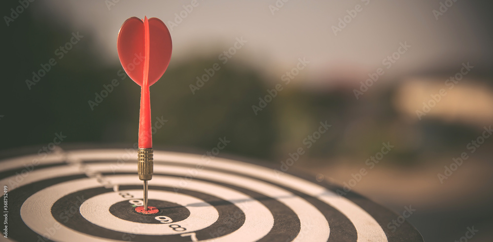 Bullseye or dart board has dart arrow throw hitting the center of a shooting target with sunshine for business targeting and winning goals business concepts.