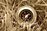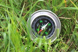 round compass on background of summer grass as symbol of tourism with compass, travel with compass and outdoor activities with compass