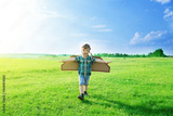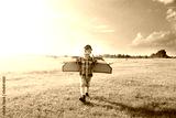 Start traveling from childhood even in imagination. Laughing boy with plane on a lawn