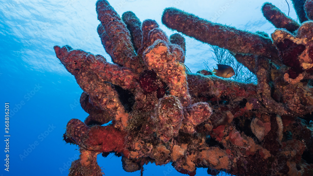Seascape in turquoise water of coral reef in Caribbean Sea / Curacao with fish, coral and Tube Sponge