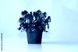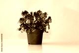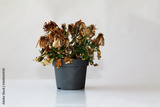 Dried plant in a pot on a gray background. The flower wilted in the pot. The indoor flower is dry. Close-up view.