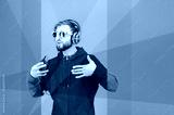 Funky young bearded hipster man in glasses and headphones dances and listens pleasurable music in his smartphone. love live. Leisure hobby mood concept. Relax.