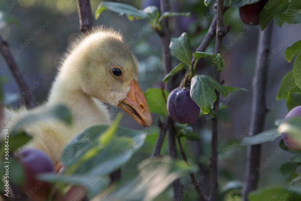 Young goose is walking in a backyard.