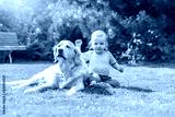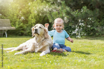Cute liitle baby boy is waving at the camera posing with Golden Retriever dog in the garden