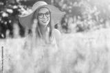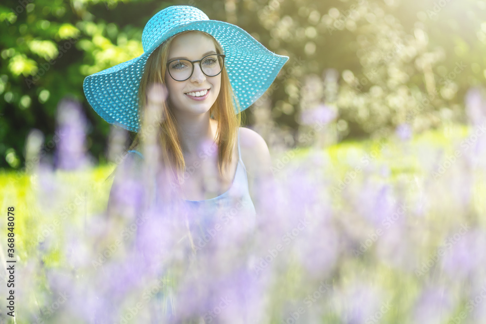 Portrait of smiling young woman with glasses wearing turquoise summer hat is posing behind lavender in the garden