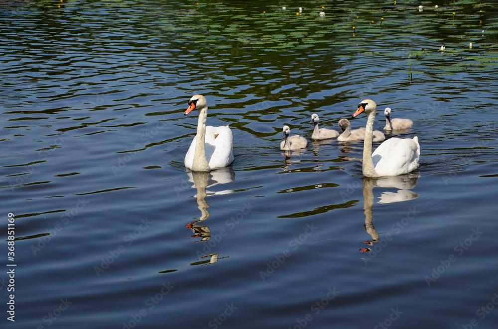Two white swans swim with small geese in a pond. A brood of wild birds. Offspring of white swans.