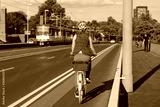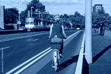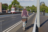 Female cyclist ride bicycle on bicycle lane beside road on the bridge cross Rhine River in Düsseldorf, Germany. Cycling friendly city concept in Europe.