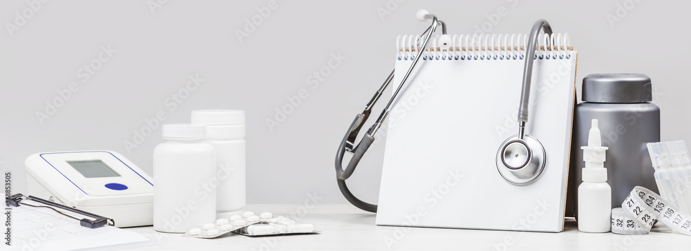 Medicine and pharmacy background. Pills and stethoscope with measure tape against notepad. Medical concept web banner. Copy space monochrome.