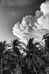 Cumulus clouds of during sunset on a background of palm trees.