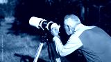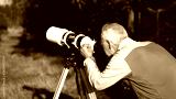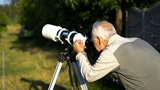 Telescope to nature. A retired man looks at the moon through a telescope. Retired hobby. Blurred background.