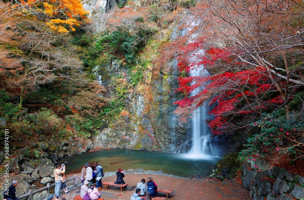Beautiful scenery of a grand waterfall tumbling down the vertical rocky cliff into a green pond surrounded by colorful autumn foliage in Meiji no Mori Minoh National Park in Osaka, Kansai, Japan