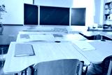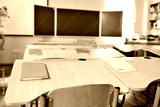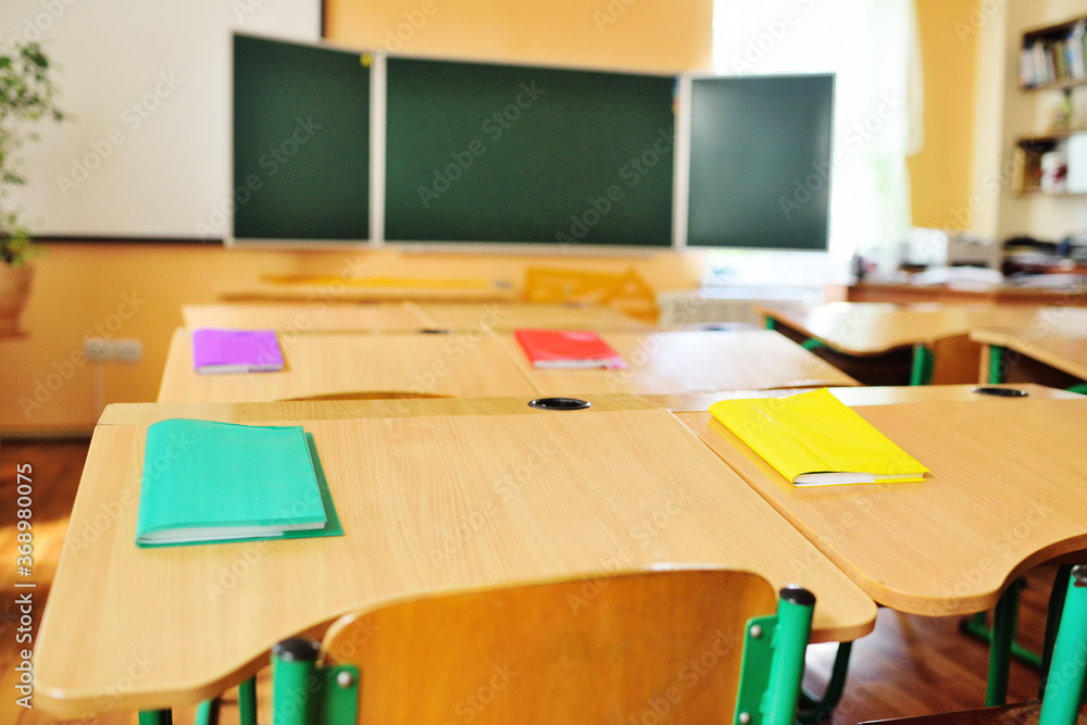 an empty schoolroom without people, a green blackboard and wooden desks with chairs-preparation for the lesson, back to school, education, Knowledge Day. Modern school interior.