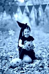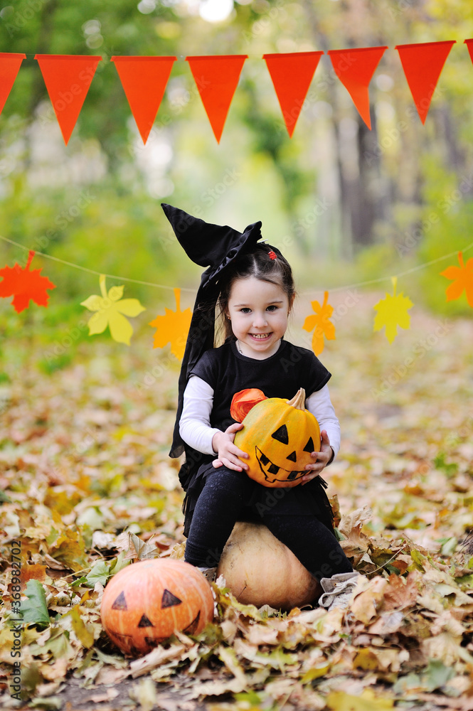 child little witch on Halloween on a background of autumn leaves and pumpkins