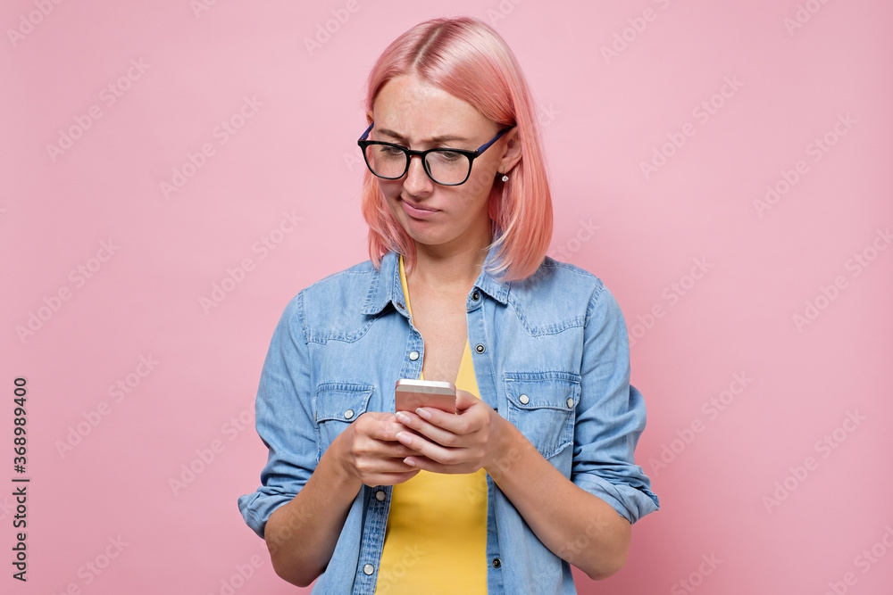 girl with pink dyed hair holding smartphone being angry to receive a spam sms.