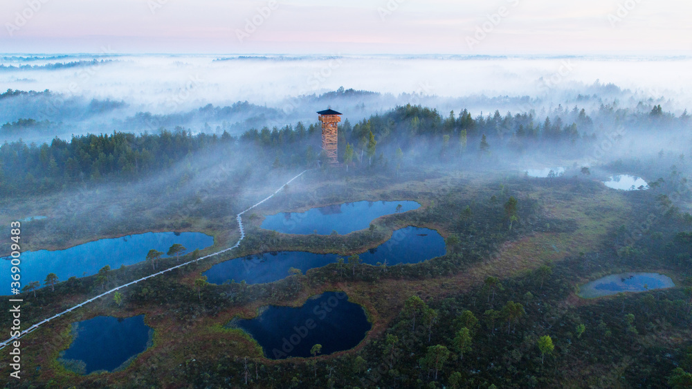 An aerial view of beautiful bog in Estonian nature during foggy sunrise with a watching tower and wooden hiking trail, Northern Europe.
