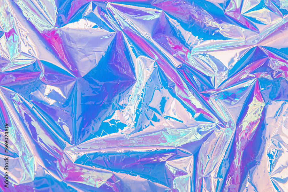 Blurred abstract Modern pastel colored holographic background in 80s style. Crumpled iridescent foil real texture. Synthwave. Vaporwave style. Retrowave, retro futurism, webpunk