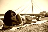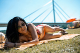 An attractive young woman with black long hair lies on a towel on the lawn by the river. She is wearing an orange bikini and sunglasses and a large bridge can be seen behind her.