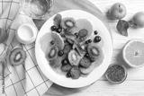 Composition with plate of fresh fruit salad on white wooden table, top view