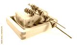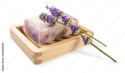 Homemade natural lavender soap on wooden soap dish isolated on white.